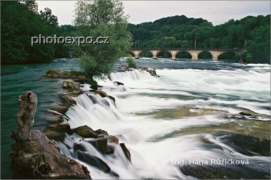 Vrchní část Rýna těsně nad Rýnským vodopádem (Rheinfall), největším evropským vodopádem nedaleko městečka Schaffhausen. Švýcarsko