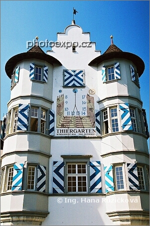 Thiergarten se slunečními hodinami, jeden ze zajímavých a svébytně zdobených domů ve městě Schaffhausen. Švýcarsko
