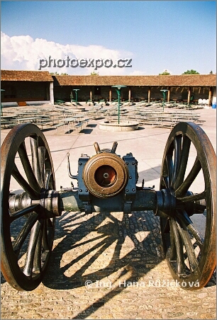 Dělo na střeše kruhové pevnosti Munot (16. stol.) má dokazovat její dělostřeleckou minulost. Schaffhausen, Švýcarsko.
