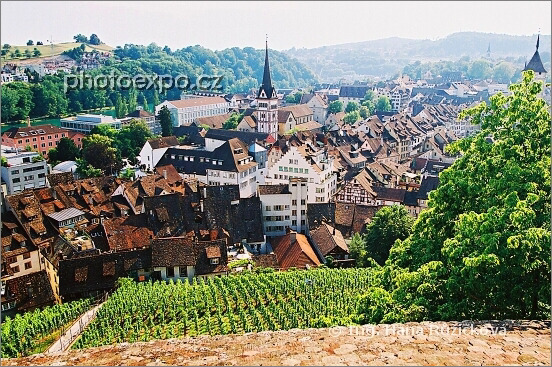 Výhled z kruhové pevnosti Munot na starobylé město Schaffhausen s komplexem bývalého benediktinského opatství a přilehlé vinice. Schaffhausen, Švýcarsko.