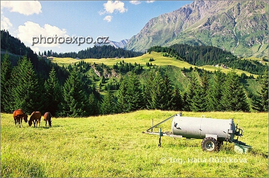 Idylická krajina s koňmi v údolí Mesolcina na jižní straně pod průsmykem Svatého Bernardina. Graubünden, Švýcarsko.