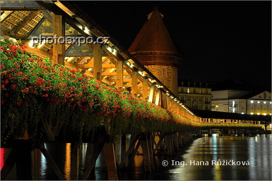 Večerně nasvícená dominanta a symbol Lucernu/Luzernu, Kaplový most (Kapellbrücke) ze 14. století bohatě zdobený muškáty je nejstarším dřevěným mostem v Evropě. Je zdobený obrazy a jeho součástí je osmiboká vodárenská věž (Wasserturm), jež sloužila jako maják, vězení a pokladnice. Luzern, Švýcarsko.