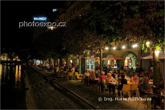 Večerní posezení na nábřeží řeky Reuss, tzv. Rathausquai, v Lucernu. Luzern, Švýcarsko.