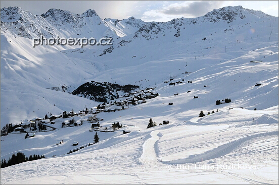 Tzv. Inner Arosa pohledem ze sjezdovek zimního areálu kolem Weisshornu (2653 m). Graubünden, Švýcarsko.