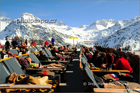 Zimní lebedění si na sluníčku na plošině u Tschuggenhütte v zimním areálu kolem Weisshornu (2 653 m n.m.). Graubünden, Švýcarsko.