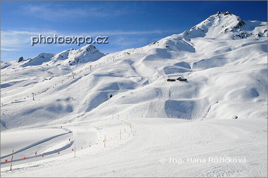 Zimní areál Arosa se rozprostírá kolem vrcholu Weisshorn (2 653 m n.m.). Graubünden, Švýcarsko.