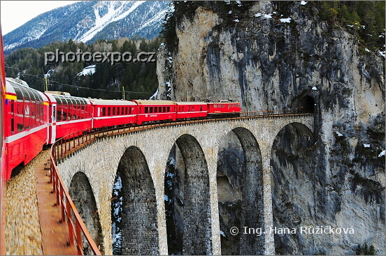 Kvalitní, přesná a všudypřítomná železniční doprava je švýcarským fenoménem stejně jako typické kamenné mosty, které jsou díky členitému alpskému terénu její nezbytnou součástí. Snad nejznámějším a nejfotografovanějším takovým mostem je Landwasserviadukt - zde pohledem z RegioExpressu jezdícím mezi Churem a St. Moritzem. Švýcarsko