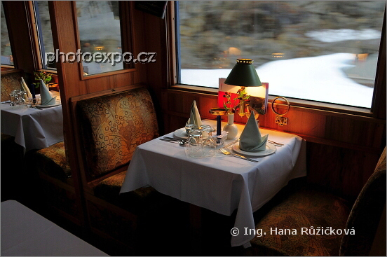 Historický jídelní vůz jako součást lokálky. U nás těžko, ale ve Švýcarsku realita. Zde je konkrétně součástí RegioExpressu jezdícího mezi Churem a Svatým Mořicem. Graubünden, Švýcarsko.