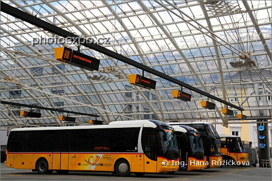 Autobusové nádraží v Churu. Typické žluté poštovní autobusy "PostAuto" slouží nejen poštovním účelům, ale také jako osobní přeprava především tam, kam vlaky nejezdí. Efektivní spojení dvou služeb. Graubünden, Švýcarsko.