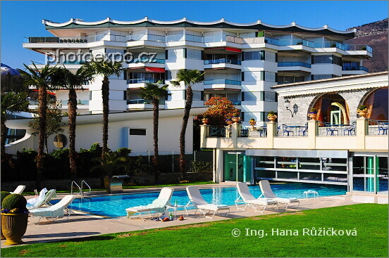 Vzhled hotelu Eden Roc***** a jeho okolí evokuje tropickou přímořskou atmosféru ačkoli je skutečné moře na hony vzdáleno. Blízko je pouze jezero Maggiore a městečko Ascona. Ticino, Švýcarsko.