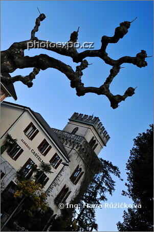 Hotel Castello Seeschloss **** a pokroucené větve stromů na promenádě městečka Ascona v magickém podvečerním světle. Ticino, Švýcarsko.