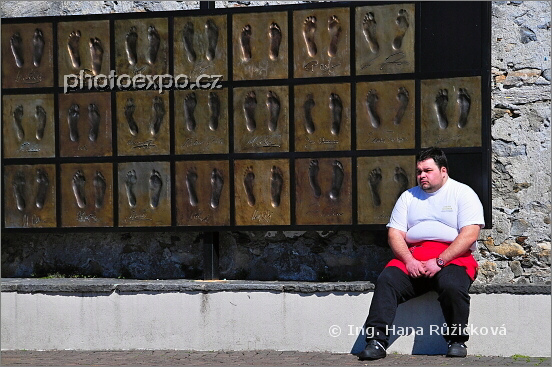 "Šlápotová" zajímavost na hlavní promenádě Piazza Giuseppe Motta v Asconě úsměvně doplněná statistou při těle. Ascona, Ticino, Švýcarsko.