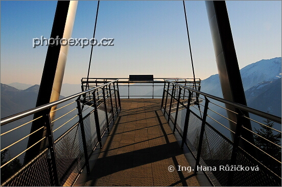 Konstrukce vyhlídky na Cardadě (1 340 m n.m.) zavěšené nad údolím. To byly výhledy! Locarno, Ticino, Švýcarsko.
