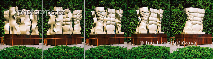 Otáčivé fragmenty se spojují do ideálně vypracovaného mužského trupu. Sošné umělecké dílo v Olympijském parku u Muzea olympijských her (Musée Olympique) v Lausanne - Ouchy. Vaud, Švýcarsko.