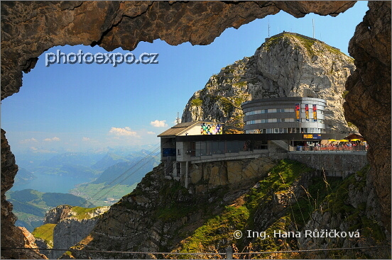 Výhled z Dračí jeskyně (Drachenwegg) na moderní hotel Bellevue a vrchol Esel (2 118 m n.m.) s vyhlídkovou plošinou. Pilatus, Luzern, Švýcarsko.