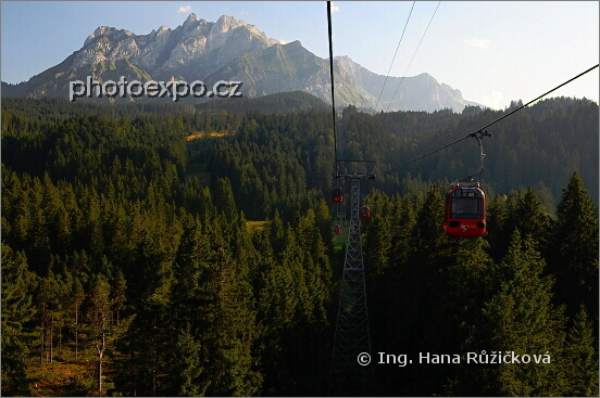 Kabinovou lanovkou se snášíme z vrcholu Pilatus (2 132 m n.m.) přes zastávku Fräkmuntegg (1 416 m n.m.) do Kriensu u Luzernu. Luzern, Švýcarsko.
