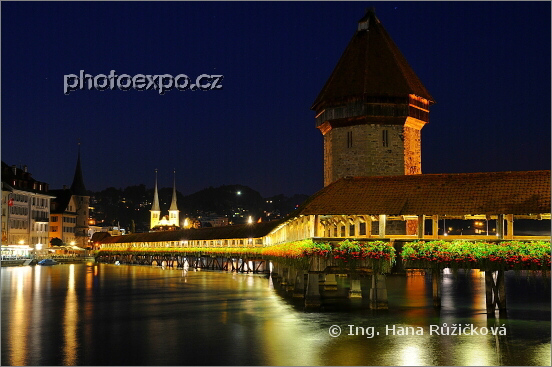 Večerně nasvícená dominanta a symbol Lucernu (Luzern), Kaplový most (Kapellbrücke) ze 14. století bohatě zdobený muškáty je nejstarším dřevěným mostem v Evropě. Je zdobený obrazy a jeho součástí je osmiboká vodárenská věž (Wasserturm), jež sloužila jako maják, vězení a pokladnice. Švýcarsko