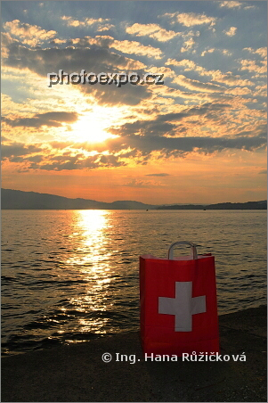 Drobná propagace Švýcarska na břehu Vierwaldstättského jezera (Vierwaldstättersee) při západu slunce u Vitznau. Luzern, Švýcarsko.