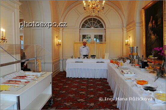 Bufetové stoly s obsluhou při snídani v Park Hotelu Vitznau ***** ve Vitznau u jezera Vierwaldstättersee. Luzern, Švýcarsko.