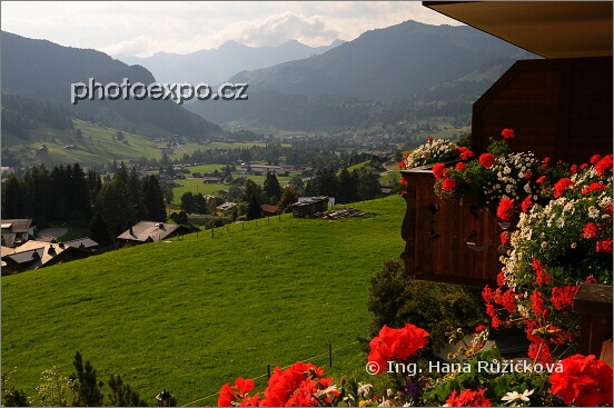 Výhled z bohatě muškáty zdobeného balkonu mého pokoje v hotelu Le Grand Chalet **** v Gstaadu. Bern, Švýcarsko.