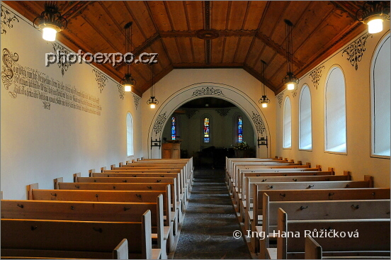 Jednoduchý a působivý interiér kaple Sv. Mikuláše (St. Niklauskapelle) v Gstaadu. Bern, Švýcarsko.