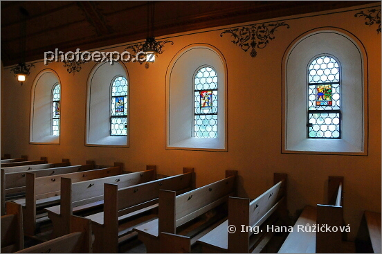Jednoduchý a působivý interiér kaple Sv. Mikuláše (St. Niklauskapelle) v Gstaadu. Bern, Švýcarsko.