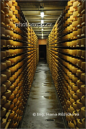 Bochníky světoznámého sýra Gruyère zrající v sýrárně La Maison du Gruyére, kde jinde než v městečku Gruyères. Fribourg, Švýcarsko.