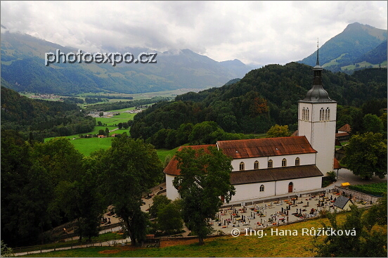 Kostel sousedící s Château de Gruyères ve středověkém městečku Gruyères, které se proslavilo výtečným sýrem Gruyère. Fribourg, Švýcarsko.