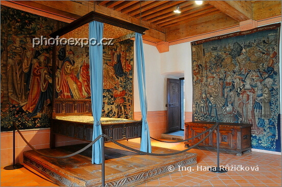 Interiér Château de Gruyères, hradní dominanty městečka Gruyères postavené v 11. století. Vystaveny jsou zde i nádherné tapisérie ze 16. století. Fribourg, Švýcarsko.
