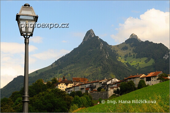 Pohled na historickou část městečka Gruyères, proslaveného sýrem Gruyère. Fribourg, Švýcarsko.