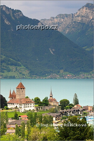 Středověký hrad ve Spiezu (Schloss Spiez) na břehu jezera Thuner (Thuner See). Vpravo od hradu se nachází románský kostel s barokním interiérem. Výhled od vlakového nádraží ve Spiezu, Bern, Švýcarsko.