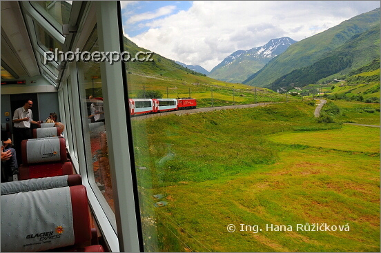 Panoramatické vagony Ledovcového expresu (Glacier Express) umožňují téměř splynutí s okolní krajinou :=). Švýcarsko