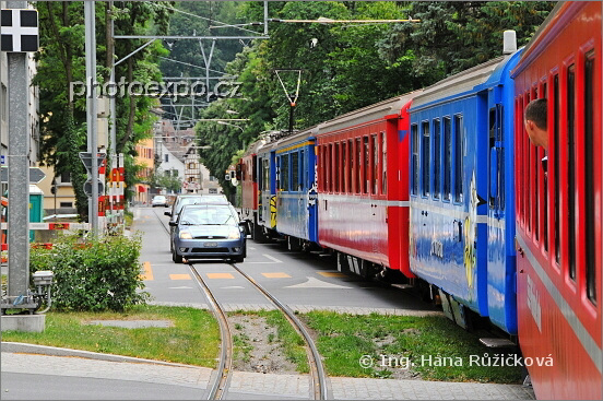 Z Arosy do Churu jsme jeli speciálně objednaným vozem Starckes Stuck navrženým ve stylu obývacího pokoje známým architektem Philippem Starckem. Vůz byl připojen k Arosa Expressu, který v Churu jezdí "po silnici mezi auty". Graubünden, Švýcarsko.