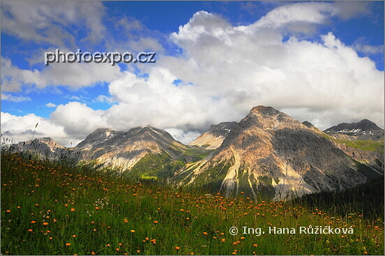 Výhledy z cesty k Horské kapli (Bergkirchli) nad Inner Arosou a hotelem Kulm na okolní Alpy a zářivé luční kvítí. Graubünden, Švýcarsko.