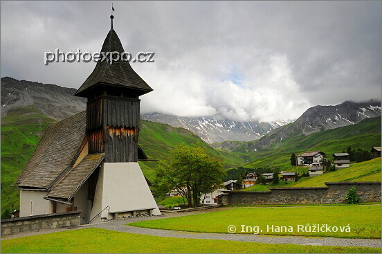 Fascinující atmosféra vyhrožujících mraků v podvečer nad městečkem Arosa. V popředí je Horská kaple (Bergkirchli), které samozřejmě sekunduje půvabný hřbitov plný barevných květů. Graubünden, Švýcarsko.