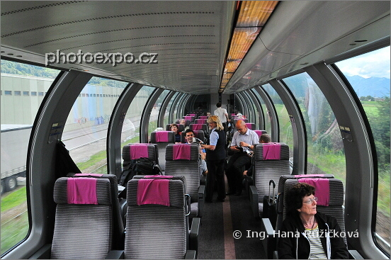 Moderní interiér vlaku "Wilhelm Tell". V tomto panoramatickém voze jsme si lebedili cestou z Bellinzony do Locarna. Švýcarsko má ve své nabídce mnoho vyhlídkových vlaků, které mají svá jména - Glacier Express, Wilhelm Tell, Bernina Express atd. - a turistům rychle a pohodlně ukazují krásy švýcarské přírody (a v jídelních vozech i gastronomie :=) Ticino, Švýcarsko.