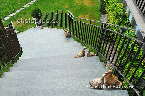 Kachní dekorace schodů vedoucích z hotelu Esplanade**** do zahrady. Pozor, nezašlápnout! Locarno, Ticino, Švýcarsko.