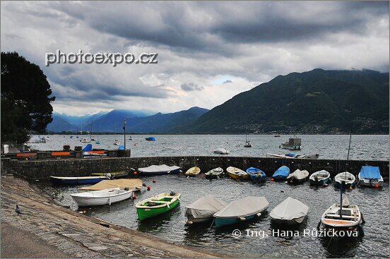 Přístav malých člunů a loděk na jezeře Maggiore v Locarnu. Večer s opravdu dramatickými mraky... Ticino, Švýcarsko.
