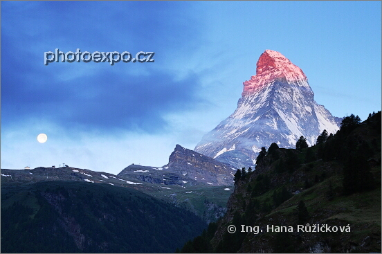 Jedinečná kombinace horské chlouby Švýcarska - Matterhornu (4 478 m n.m.) - "zapadajícího" měsíce a vycházejícího slunce, jehož první paprsky barví vrchol světoznámého štítu do zářivě oranžové barvy. Zermatt, Švýcarsko.
