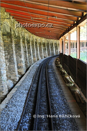 V červenci 2009 jsem měla v jednom okamžiku dva úžasné zážitky! 1. Jela jsem speciálním vozem Premiere Glacier Express z r. 1930 ze Zermattu na Gornergrat a zpět. 2. Cestou nahoru jsem byla pozvána strojvedoucím na čelní plošinu a mohla tak fotit venku nádherné okolí s mnoha čtyřtisícovkami včetně Matterhornu. Zde právě projíždíme polovičním tunelem zabudovaným do svahu. Wallis, Švýcarsko.