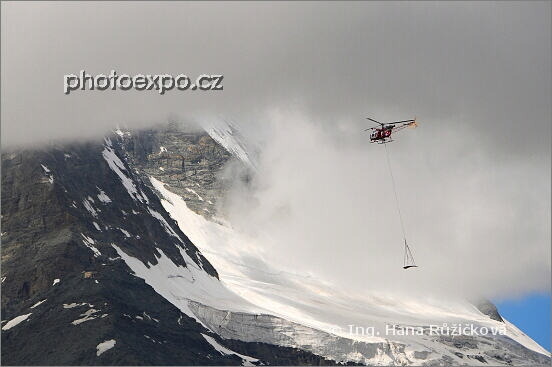 Helikoptéry jsou častým pomocníkem v horských výšinách. Zde na úpatí Matterhornu objímaného mraky dopravuje vrtulník stavební materiál z místa na místo. Wallis, Švýcarsko.