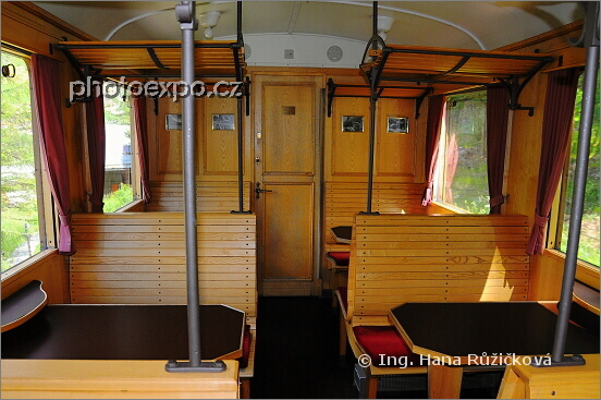 Ten střídmější ze dvou interiérů Premiere Glacier Expressu z r. 1930, kterým jsme se vezli ze Zermattu na Gornergrat a zpět. Wallis, Švýcarsko.