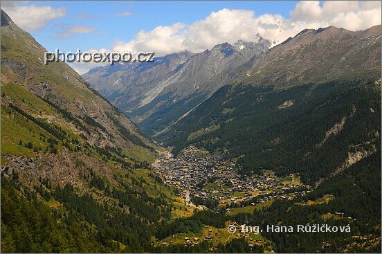 Výhled na Zermatt z lanovky vedoucí ze Zermattu, přes Furi na Schwarzsee Paradise. Wallis, Švýcarsko.