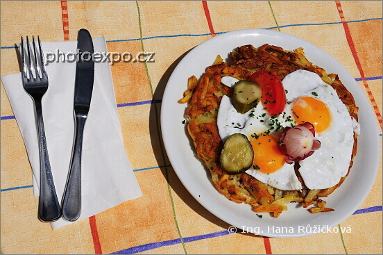 Jedno z typických švýcarských jídel - rösti - smažená placka ze strouhaných bramor, většinou doplněná sýrem a zde navíc zdobená vejci. Tuto specialitu jsem si dala v Hotel Restaurantu Schwarzsee (2 583 m n.m.) v místě zvaném Schwarzsee Paradise. Wallis, Švýcarsko.