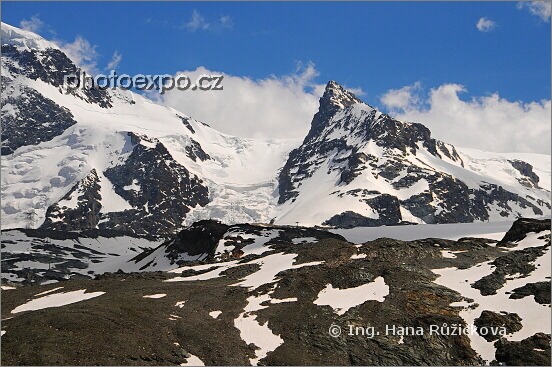 Malý Matterhorn - Klein Matterhorn (3883 m n.m.) a vlevo od něj ledovec Unter Theodulgletscher. Wallis, Švýcarsko.
