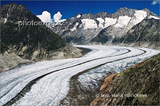 Aletschský ledovec je králem evropských ledovců. Je nejdelším alpským ledovcem (téměř 25 km), v nejširším místě měří 2 km a jeho hloubka dosahuje až 900 m! Vyplňuje rozsáhlé údolí mezi Jungfrau a údolím řeky Rhony v kantonu Wallis. Jako chráněná přírodní památka byl zařazen na seznam světového přírodního dědictví UNESCO. A pro mne byl tím nejúchvatnějším, co jsem ve Švýcarsku z přírody viděla. Wallis, Švýcarsko.