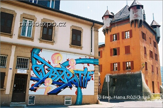 Zajímavý kontrast v městečku Sierre v kantonu Valais. Pozoruhodná budova oranžového Château des Vidomnes ze 16. století proti domu pomalovaném graffiti. Švýcarsko