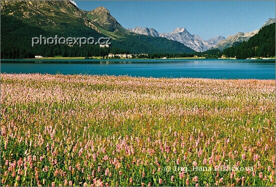 Kvetoucí růžový koberec rdesna hadí kořen u vesničky Sils na břehu jezera Silser See, kanton Graubünden. Švýcarsko