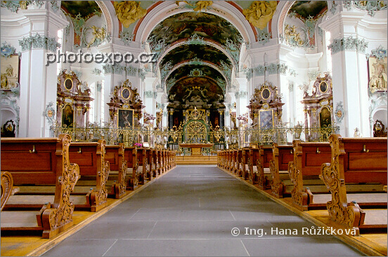 Interiér barokní katedrály v St. Gallenu. Katedrála je součástí starobylého kláštera, ke kterému přibyla až v 18. století a o její výzdobu se postarali přední umělci té doby. Bílé stěny uvnitř svatostánku představují život na zemi, navazující světlezelená štukatura přechod k vytouženému nadpozemskému životu a bohatě zdobený strop pak rajský život v nebi. Švýcarsko