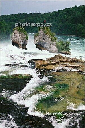 Rýnský vodopád s vápencovými skalami a vyhlídkou pohledem shora, fotografovaný KRÁTKÝM časem. Největší evropský vodopád je vysoký 23 m, hluboký 13 m a široký 150 m a leží nedaleko městečka Schaffhausen. Švýcarsko